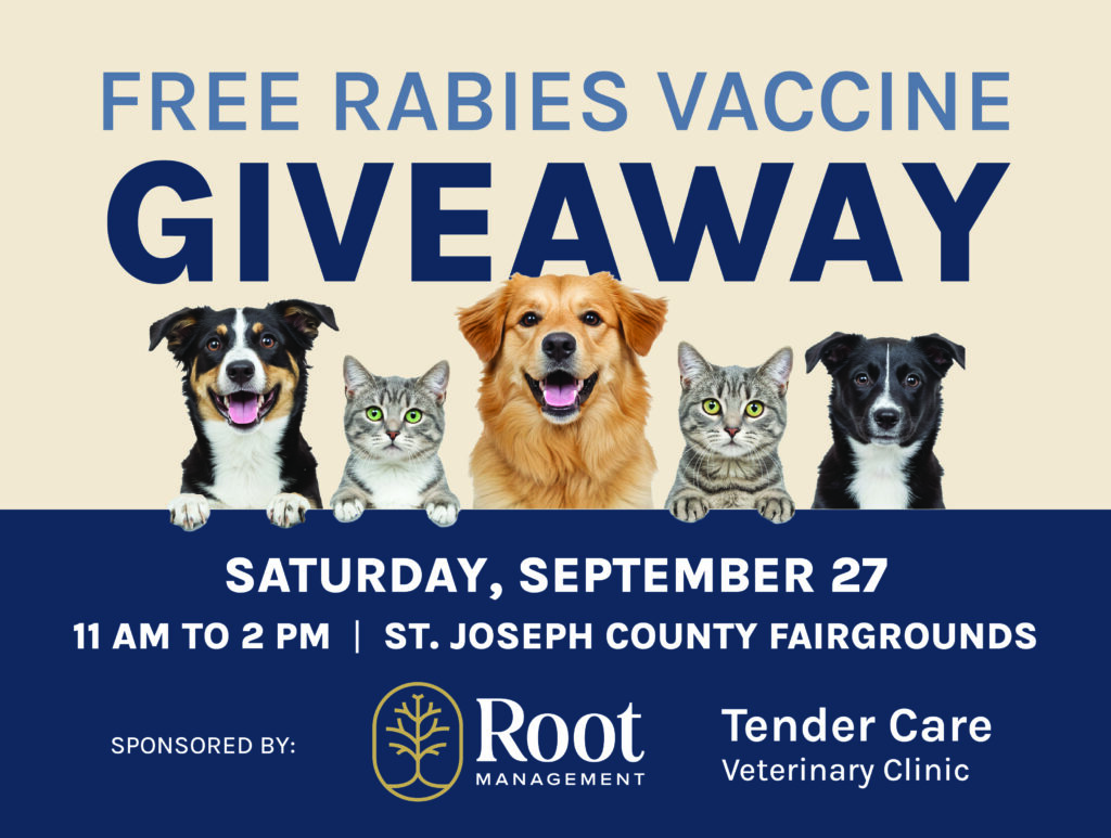 South Bend, IN – Root Management, in partnership with Tender Care Veterinary Clinic, is hosting a community event to provide 200 free rabies vaccines for pets on Saturday, September 27, from 11:00 am to 2:00 pm at the St. Joseph County 4-H Fairgrounds.